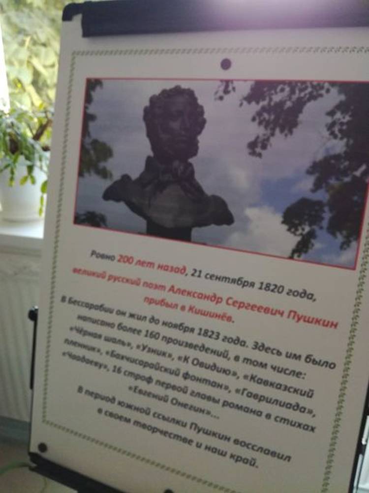 Почти три года жизни – с сентября 1820 по ноябрь 1823 года – А.С. Пушкин прожил в Молдавии, ставшей «священной для души поэта». Здесь им были созданы две его самые яркие поэмы – «Братья разбойники» и «Бахчисарайский фонтан», закончен «Кавказский пленник», написаны более ста шестидесяти стихотворений, в том числе такие шедевры,  как «Чёрная шаль», «К Овидию», «Песнь о вещем Олеге», «Узник». Здесь поэт начал писать роман в стихах «Евгений Онегин».