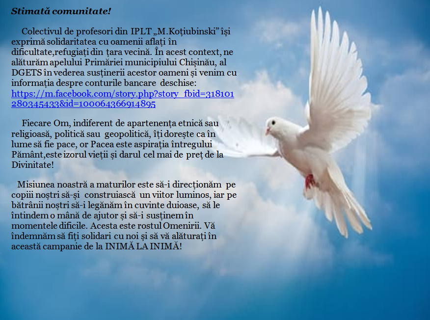 Учительский коллектив лицея «М. Коцюбинский» выражает солидарность с беженцами из соседней Украины, находящимися сегодня в тяжелейших обстоятельствах. В связи с этим мы присоединяемся к призыву. Городской примэрии и Департамента образования поддержать этих людей и размещаем информацию об открытых банковских счетах.