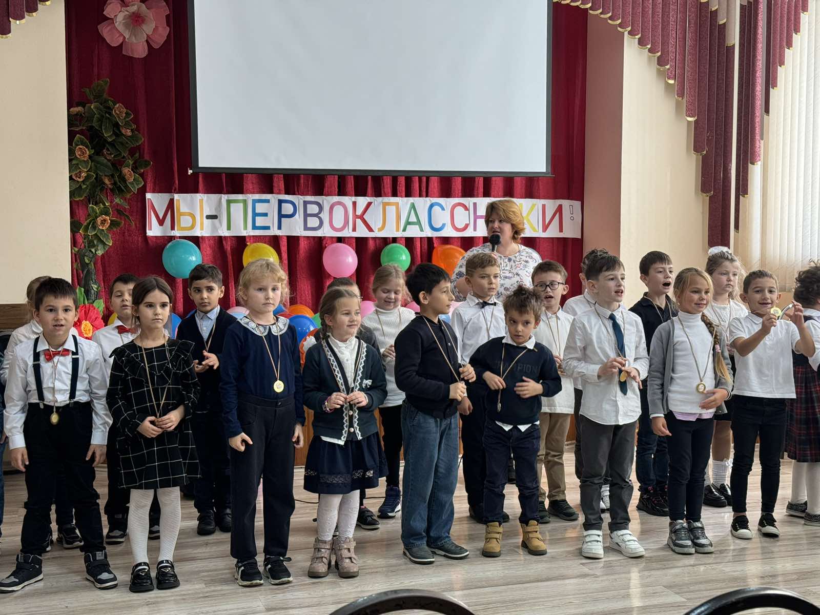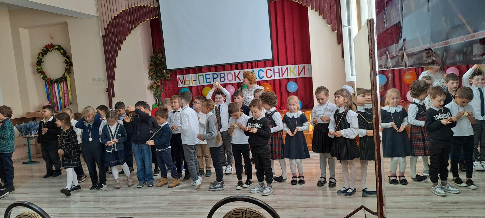 Два месяца маленькие школьники знакомятся со школьной жизнью. За это время они многому научились, многое узнали. И вот настало время стать полноправными членами школьной семьи. Виновники торжества пришли на праздник нарядные и, конечно же, с хорошим настроением. Конечно, чтобы поддержать первоклассников, были приглашены и родители. Юные первоклассники красиво прочитали стихи, спели песни, исполнили танец маленьких цыплят. Не обошлось и без Гимна Первоклассников. В конце праздника каждый ученик получил медаль первоклассника и небольшой сладкий подарок.