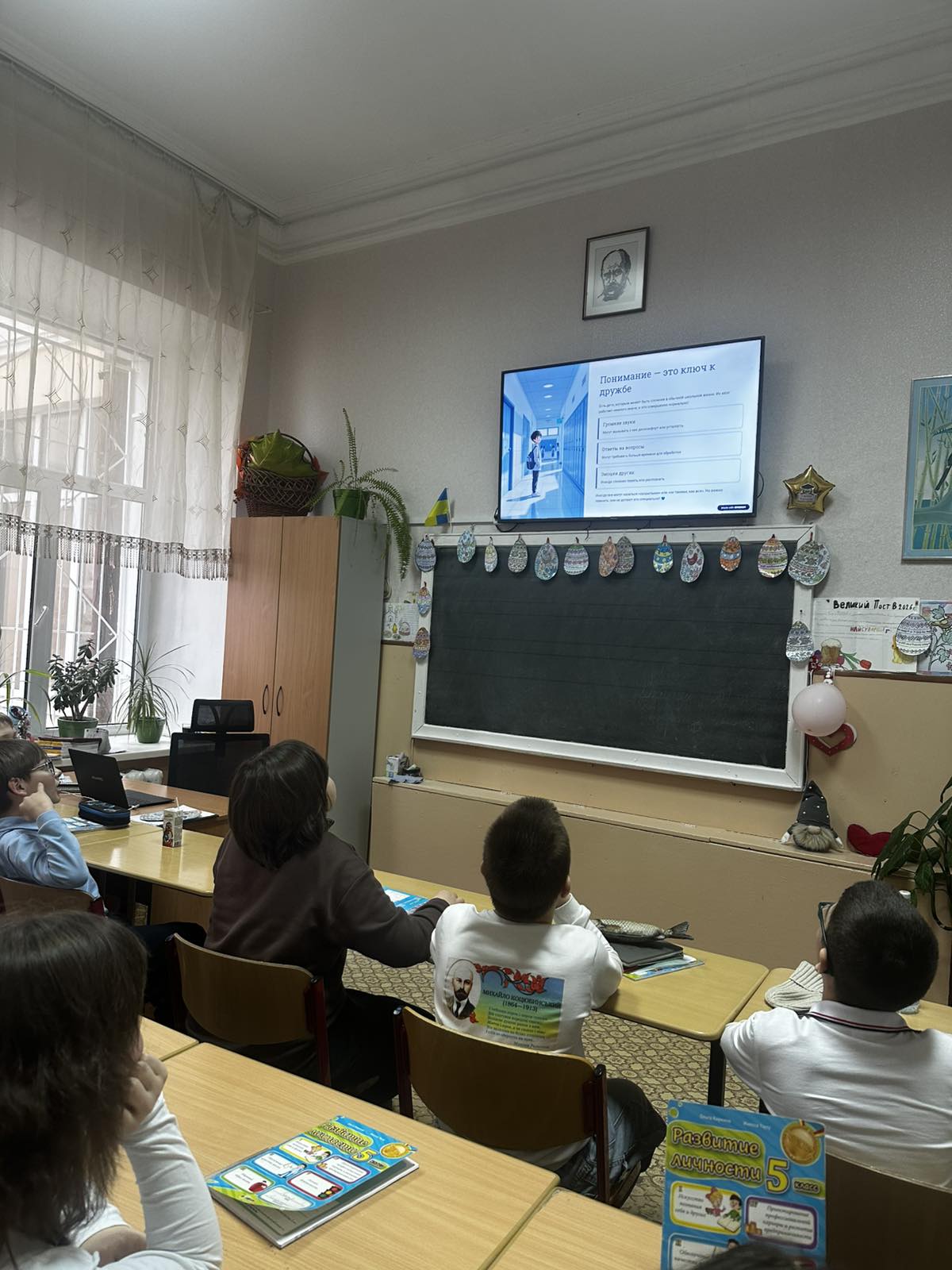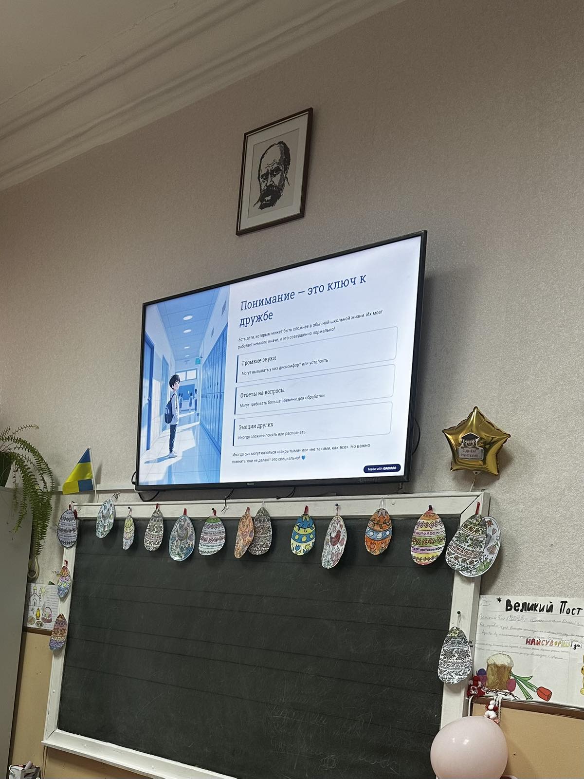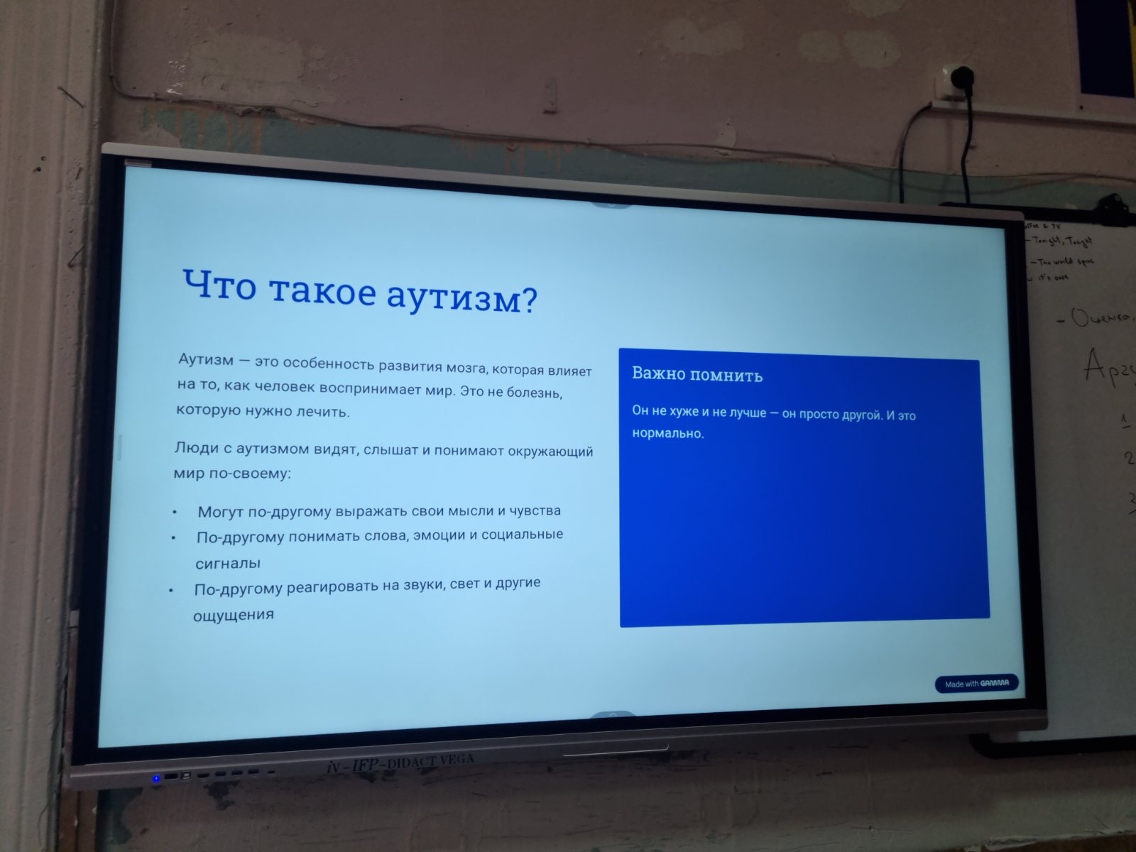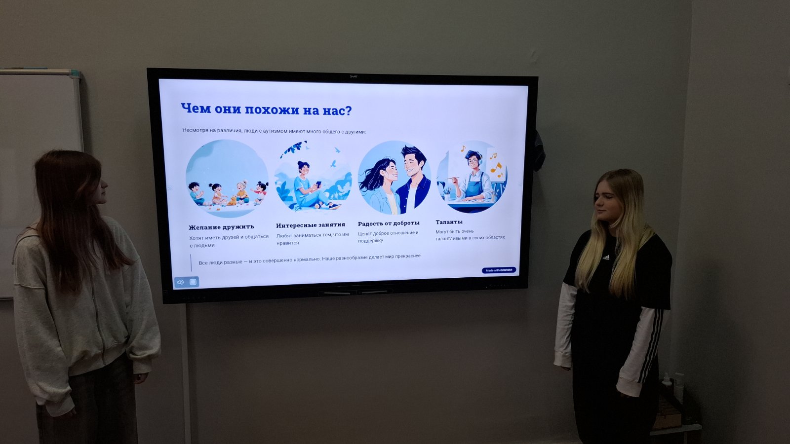Целью мероприятия стало формирование у учащихся понимания особенностей людей с разным восприятием мира и развитие толерантного отношения. В ходе работы были использованы тематические презентации, адаптированные с учётом возрастных особенностей обучающихся. Для учащихся начальных классов материал был представлен в доступной и наглядной форме с использованием простых примеров и визуальных образов. Для учеников среднего звена информация была дополнена пояснениями о поведении и способах поддержки сверстников. В старших классах акцент был сделан на осознании значимости темы и формировании эмпатии. В процессе мероприятия учащиеся активно участвовали в обсуждении и задавали вопросы.